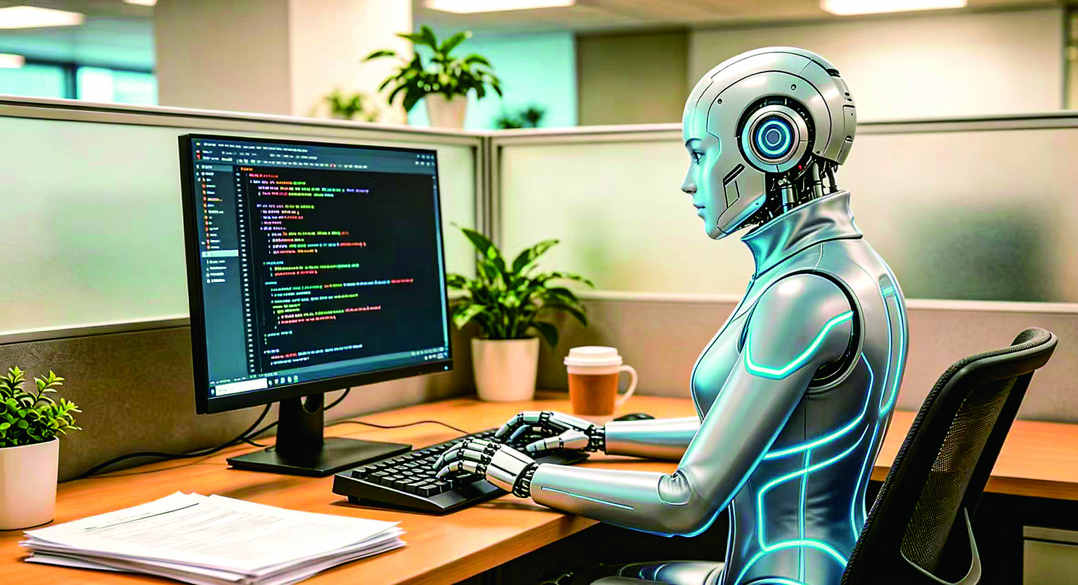 人工智能机器人正在电脑前工作。(AI生成图片)离职员工的“赛博永生”