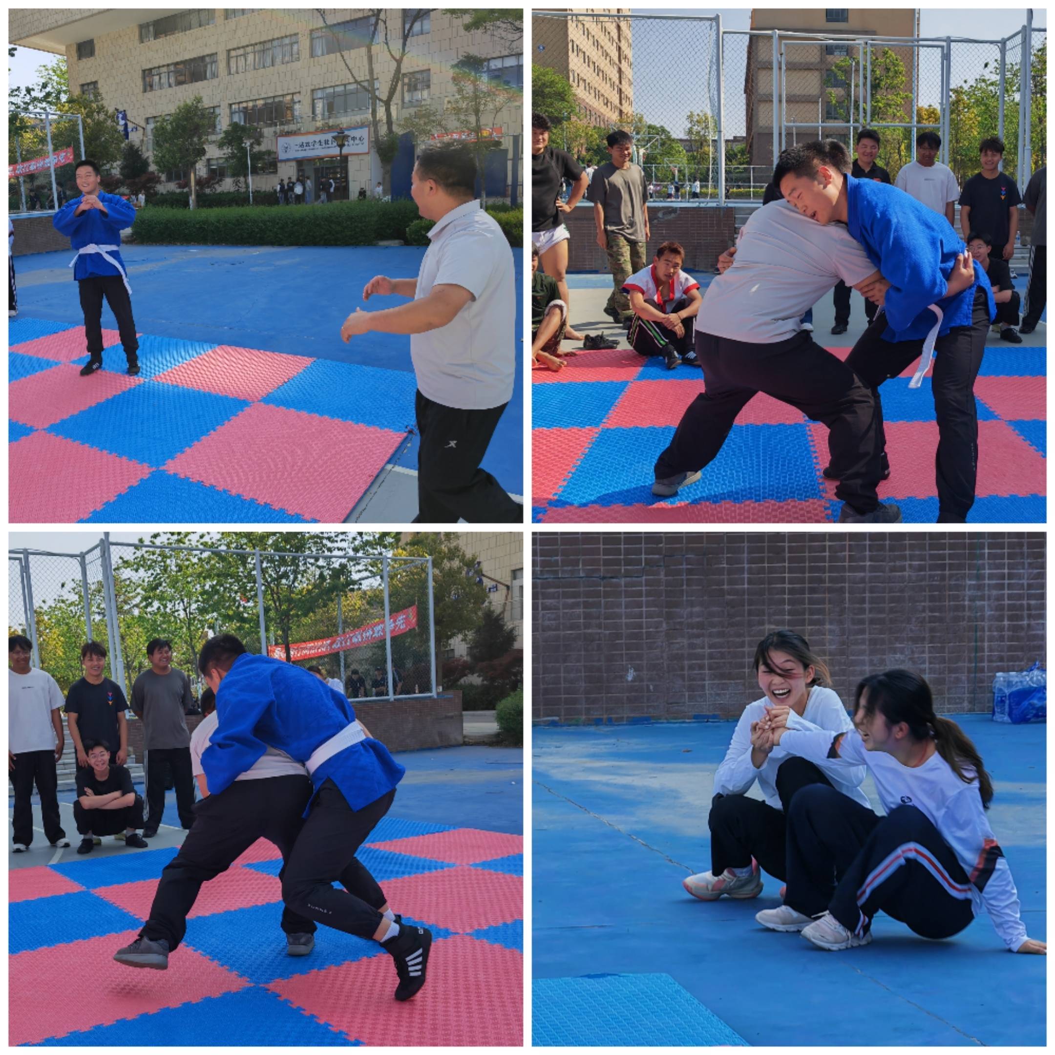 李月明老师(白衣)“挑战”摔跤队队长雷玉鑫(蓝衣),一旁的同学看乐了。练了摔跤后