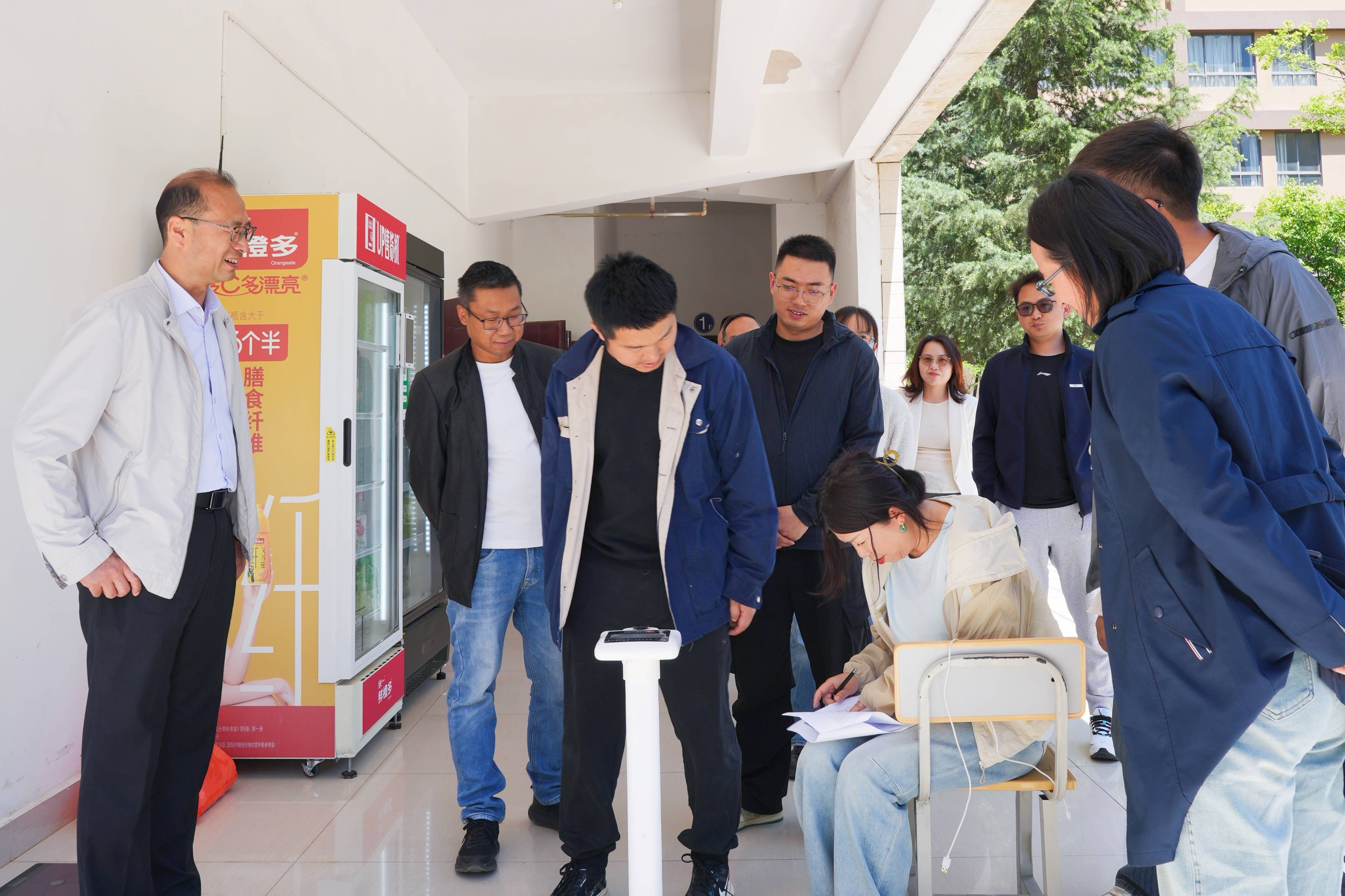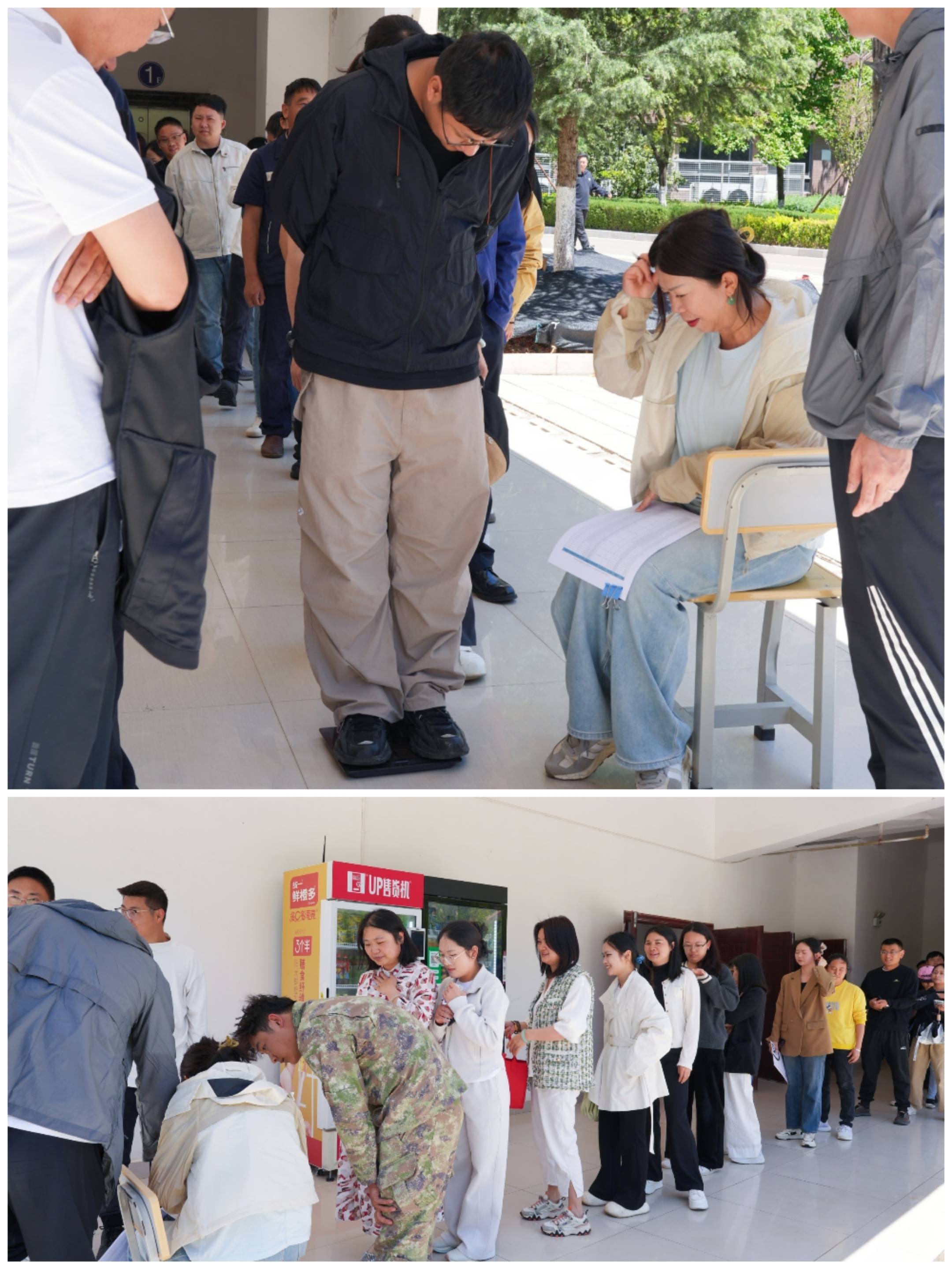 云南商务职业学院教职工排队称体重。“工会组织过健身活动