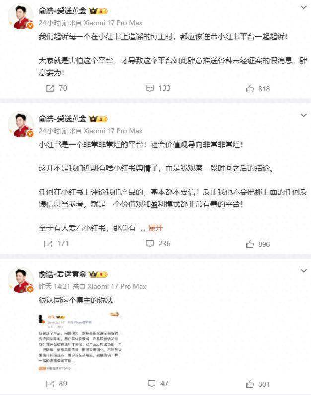 4月26日,追觅科技创始人兼CEO俞浩在其个人微博连发三条动态,言辞激烈地批评社交平台小红书,引发广泛关注。
